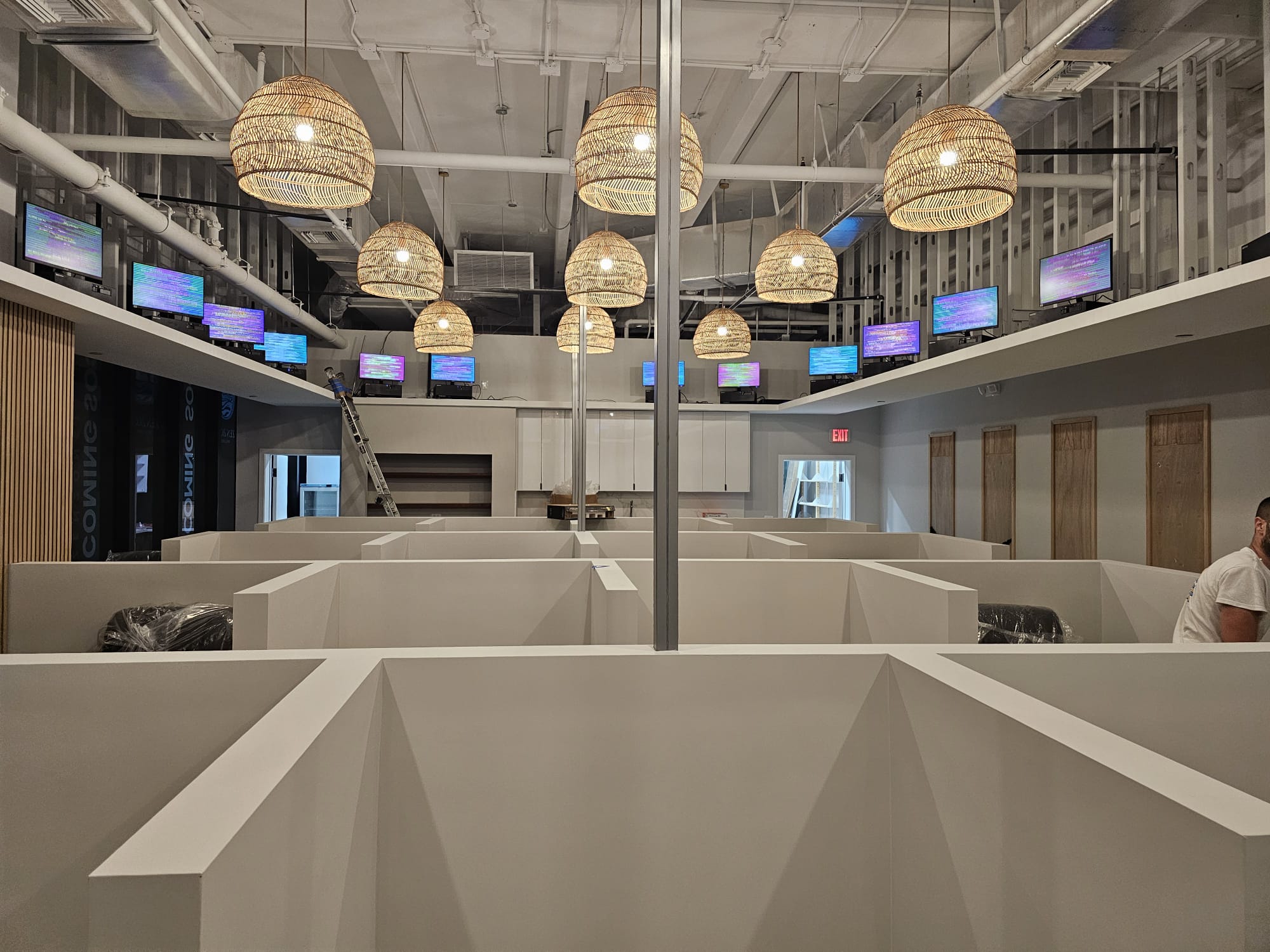This image provides a fascinating look at a high-end wellness center during its final stages of construction. The layout features a grid of private pods, designed to offer personal space for each visitor. Stylish woven pendant lights hang above, hinting at a chic, natural design theme, while the EESystem screens are already installed and running along the upper perimeter.