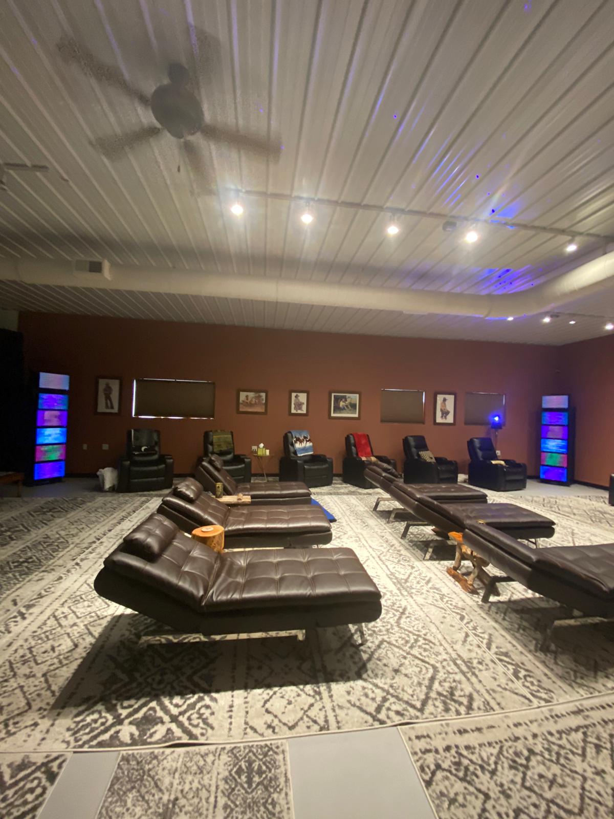 This image showcases a vast wellness hall with a unique blend of industrial and earthy aesthetics, featuring a high corrugated metal ceiling and warm, terracotta-colored walls. The expansive floor is covered by a large, bohemian-style patterned rug and is filled with numerous chaise lounges for large group sessions. Providing a futuristic contrast to the rustic decor are two tall stacks of EESystem screens, infusing the grounded space with vibrant, colorful energy.