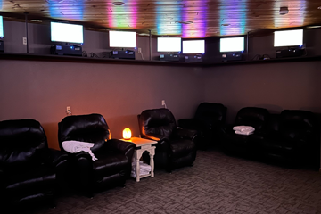 This image portrays a cozy and inviting therapy room designed for group relaxation. The space is furnished with plush black leather recliners, and a Himalayan salt lamp casts a warm, soothing glow.