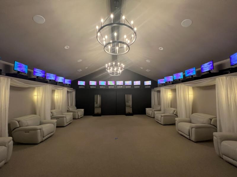 This image displays an elegant and spacious wellness hall, defined by its high ceilings and symmetrical design. Light-colored recliners are arranged in two long rows, with sheer white curtains creating semi-private bays.
