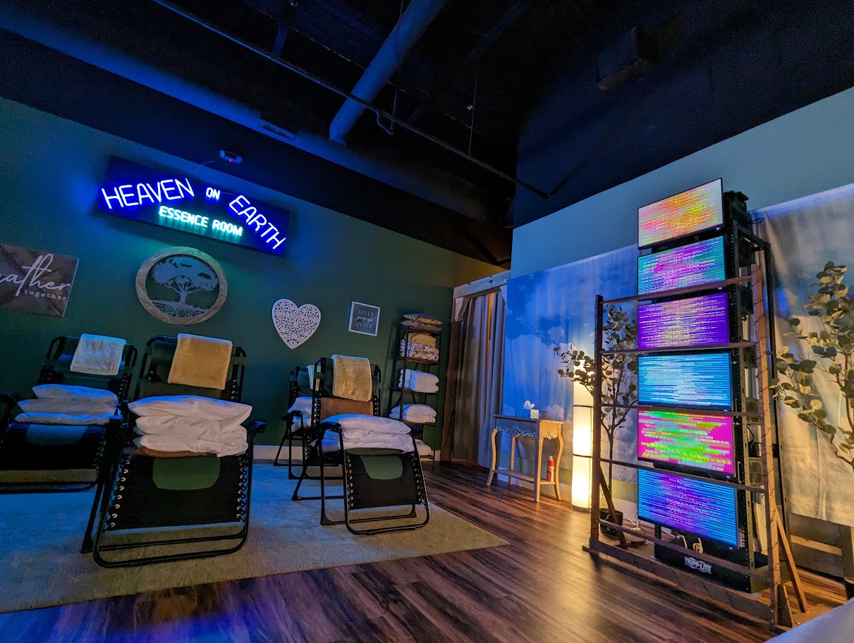 This image showcases a soulful and atmospheric wellness studio, aptly named the "Heaven on Earth Essence Room" as displayed by a prominent blue neon sign. The cozy space is arranged with comfortable lounge chairs and features an eclectic mix of inspirational art and a serene sky mural. A tall stack of vibrant EESystem screens provides a futuristic glow, blending advanced technology with a warm, restorative ambiance to create a unique healing sanctuary.