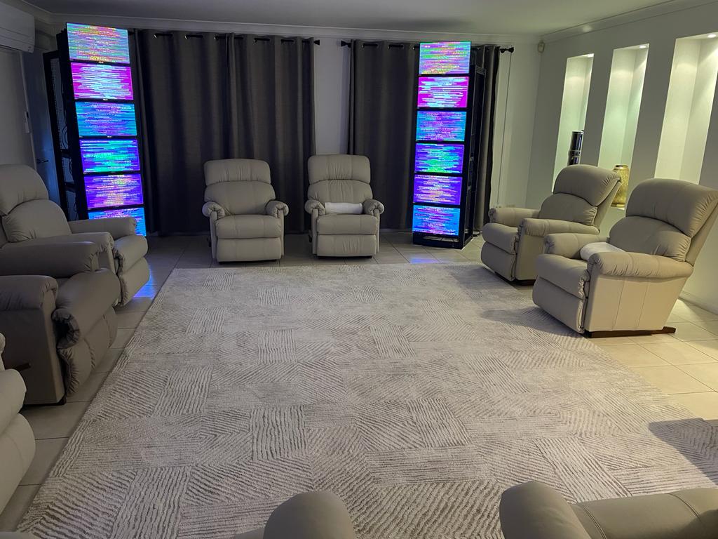 Flanking the back wall, two tall stacks of EESystem screens emit a vibrant, colorful light, serving as the technological centerpieces in this clean, modern sanctuary.