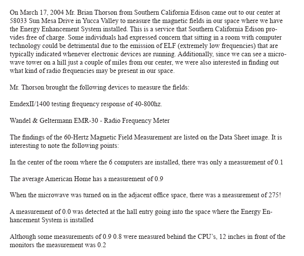 A field survey conducted by Southern California Edison (SCE) has confirmed that the Energy Enhancement System (EESystem™)-a scalar field-generating technology designed for wellness and regeneration-operates with negligible electromagnetic emissions, well below the levels found in typical homes or offices.